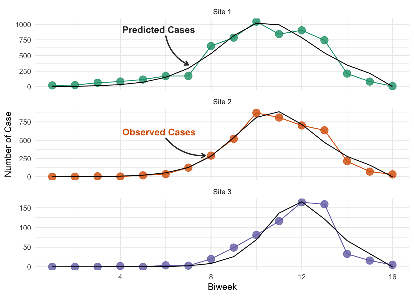 ggplot(niamey_predictions_g, aes(x = biweek, group = site)) +