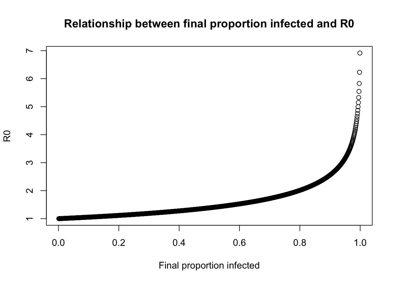 Our first approach is to estimate \(R_0\) from the final outbreak size. Although unhelpful at the early stages of an epidemic (before the final epidemic size is observed), this method is nonetheless a useful tool for post hoc analysis. The method is general and can be motivated by the argument listed in (Keeling and Rohani 2008):