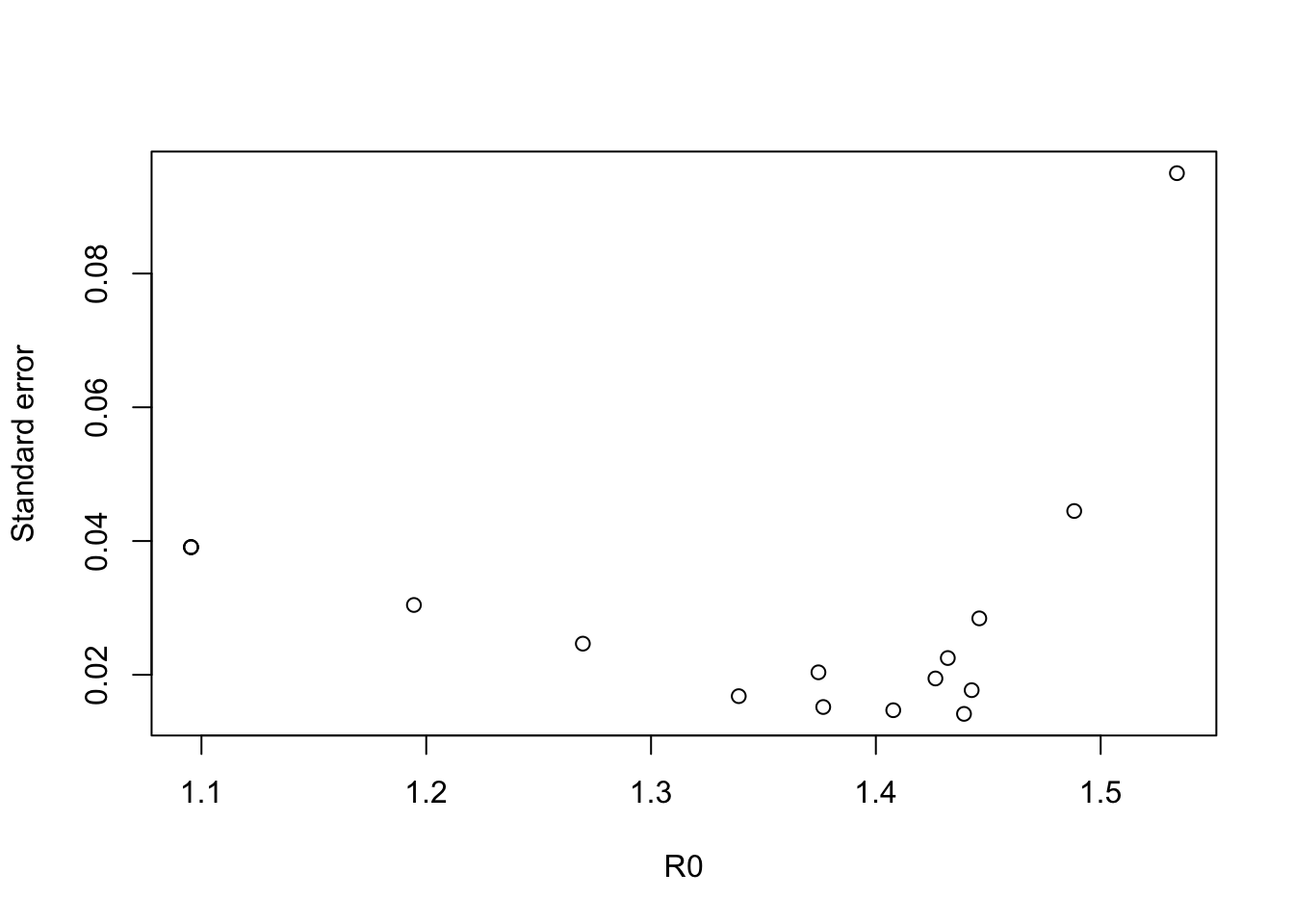 plot(R0, se, ylab = 'Standard error')
